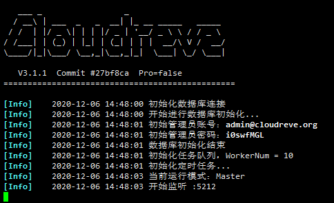 2.启动Cloudreve后,会自动创建管理员账号密码,默认监听端口为5212